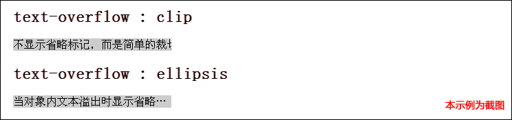 - text-overflow属性仅是注解,当文本溢出时是否显示省略标记。并不具备其它的样式属性定义。要实现溢出时产生省略号的效果还须定义:强制文本在一行内显示(white-space:nowrap)及溢出内容为隐藏(overflow:hidden),只有这样才能实现溢出文本显示省略号的效果。