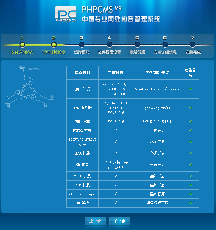 上传完毕后,开始在浏览器中安装PHPCMS V9,用你的网站域名+'/install '(例如:“http://www.abc.com/install”),进入准备安装界面: