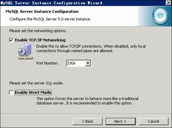 设定 MySQL 网络参数,注意:不要启用 Strict Mode! 如图 9 所示: