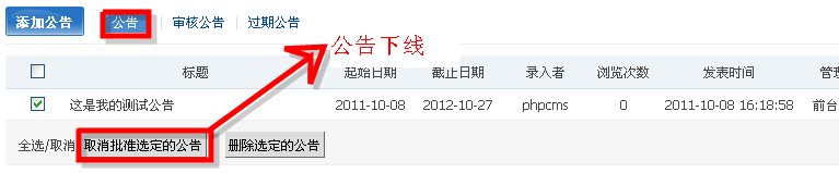 用于管理添加公告 添加新公告 审核公告 审核公告 公告下线 公告到期下线 等。