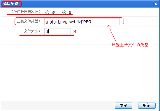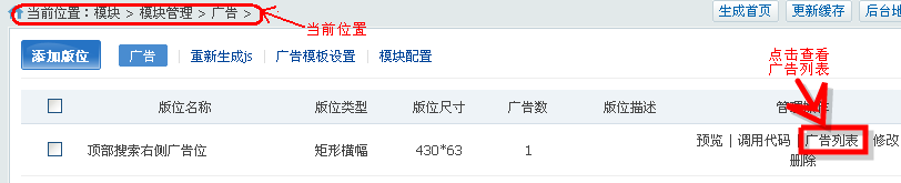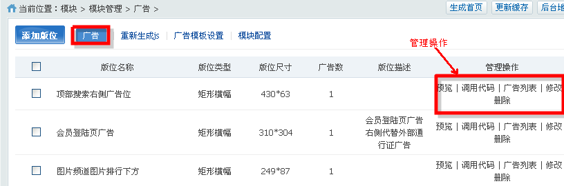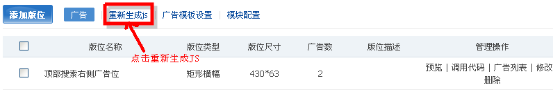 1.添加版位 版位类型:矩形横幅,固定位置,漂浮移动,对联广告,图片轮换广告,图片列表广告,文字广告,代码广告。这里不做详细展示介绍。 2.版位管理 3.添加广告 操作步骤:模块——>模块管理——>广告———>广告列表——>添加广告 4.广告管理 5.重新生成JS(注:当你修改了广告配置时,请重新生成。) 6.配置 可对广告进行配置管理,如下图: