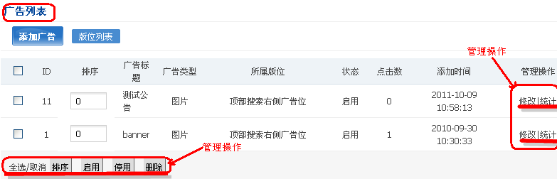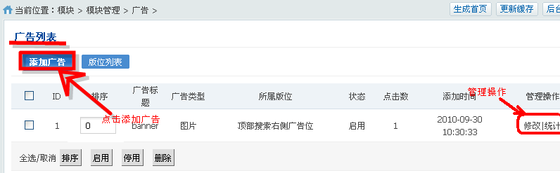 操作步骤:模块——>模块管理——>广告———>广告列表——>添加广告