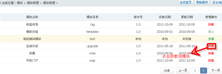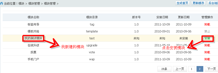1.安装 将已经创建好的模块放在指定位置,运行后台后,在“模块管理”处会找到你创建的模块。如下图: 如模块配置和代码无问题,系统将提示安装成功,否则提示错误。安装成功后你就可以使用该模块了(详情请参考V9二次开发指南)。 2.卸载 安装后的模块如果你不需要,可进行卸载。如下图:
