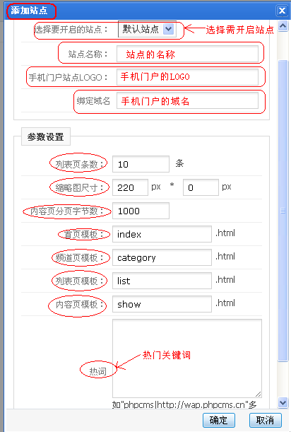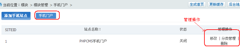 1.添加站点 注:一个站点只能添加一个手机门户。 2.管理站点 站点修改,删除和分类的管理。 3.分类管理 输入(或选择)修改(或添加)的内容。点击“提交”完成保存操作。