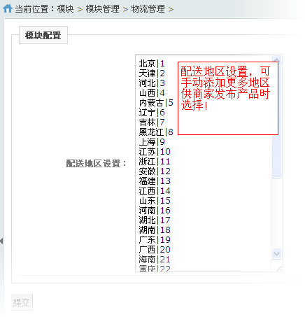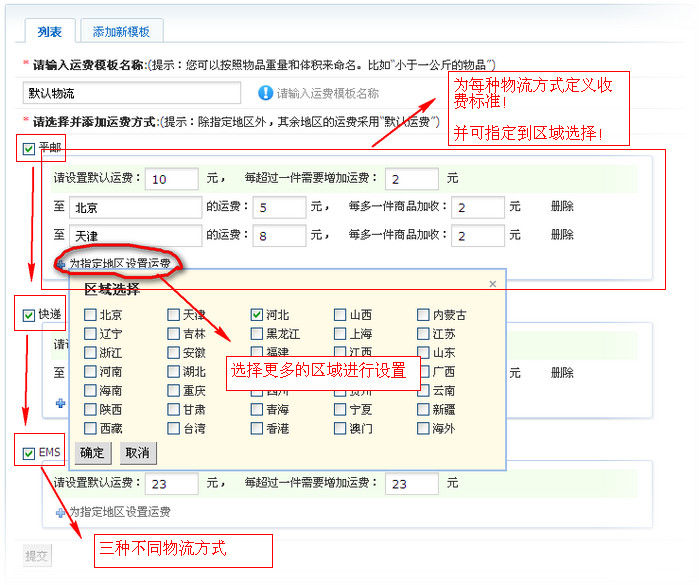 1.模块配置 2.运费模版设置 企业黄页会员,在商务中心可建立多个物流模版!并为每个物流模版定义不同的收费标准,供添加产品时重复、高效使用! 3.发布产品使用物流功能 3.页面显示效果