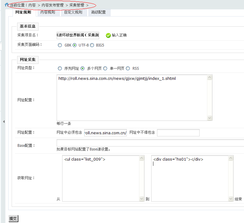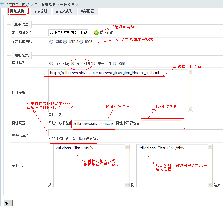 实例说明: 目标:采集新浪新闻到V9系统 “国内” 栏目中。 目标网址:http://roll.news.sina.com.cn/news/gjxw/gjmtjj/index.shtml 1、添加采集点 2. 网址规则配置1. 添加采集点,填写采集规则