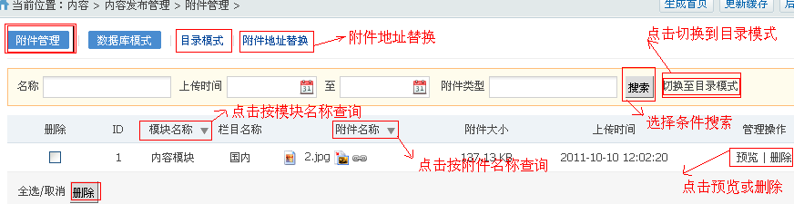 1.附件管理 A.搜索 可根据自己需求输入名称,时间段和附件类型进行附件搜索。 B.模块名称 根据自己需求选择模块名称进行搜索。搜索出的数据是选择的模块名称内的所有附件。 C.附件名称 根据自己需求选择“已使用“或”未使用“的附件。 D.预览和删除 查看附件点击”预览“按钮,删除附件点击”删除“按钮。请注意:删除之后的附件无法恢复。 E.切换至目录模式 以目录的方式查看和管理附件。如下图: F.附件地址替换 请认真阅读提示信息。