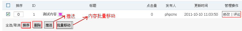 可以选择内容进行修改,评论管理,排序,推送,批量移动,删除等。