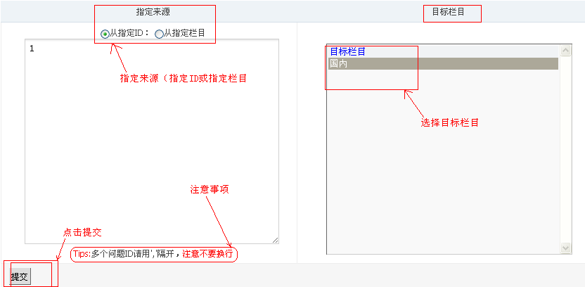 可以指定ID或指定栏目移动到右边的目标栏目。如下图: