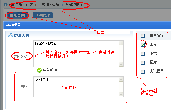 1.添加类别 填写类别基本信息,选择对应栏目。如下图所示: 添加成功后,在对应栏目内容添加时就可以选择类别。如下图所示: 2.管理类别 对类别进行管理(排序,删除,修改)。如下图所示: