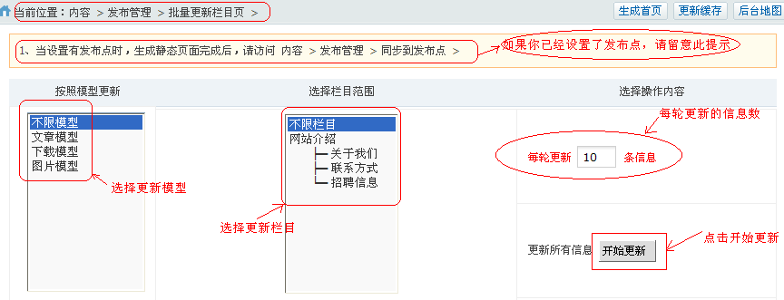 1.批量更新栏目页 选择需要更新的模型和栏目,输入每轮更新的信息数目提交则完成批量更新栏目页操作。如下图所示:
