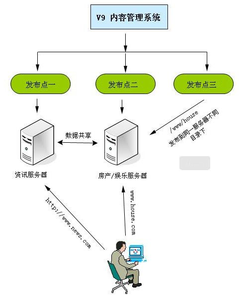 V9 系统内置的发布点功能结合站群功能,通过发布点可将各子站点内容发布到不同的服务器上,轻松实现服务器集群部署。以实现负载的分离,更加符合大访问量网站的需求。为用户提供更好的用户体验。示意图如下