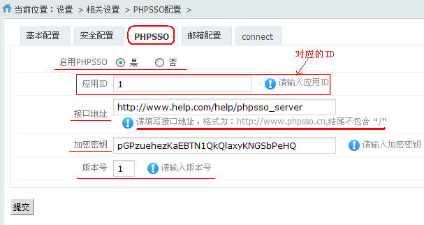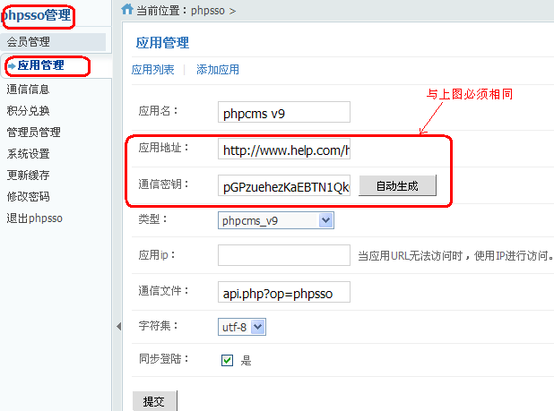 如系统启用了SSO,在 应用ID 处填写对应ID、及加密密钥。此数据和SSO里面的应用管理配置必须相同!请看图一,图二 图一:图二:
