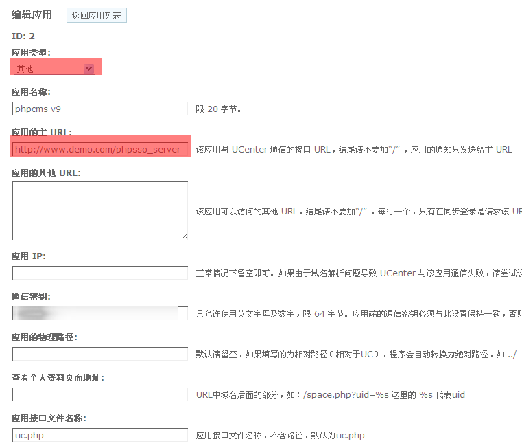 3.登录Ucenter后台,添加应用,配置相应的信息