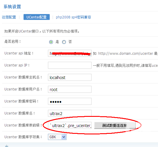 2.登录phpsso后台,系统设置 > uc设置 ,配置相应的整合信息,如图。注意!在前缀前增加数据库名称,格式如:`bbs`.pre_uc_