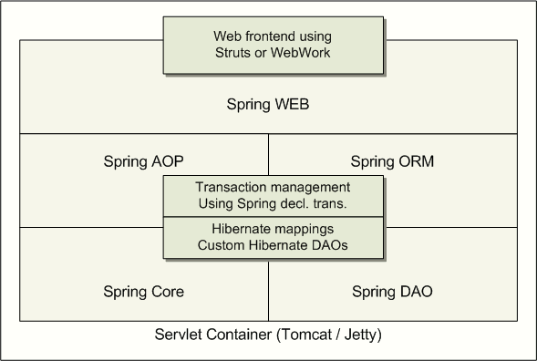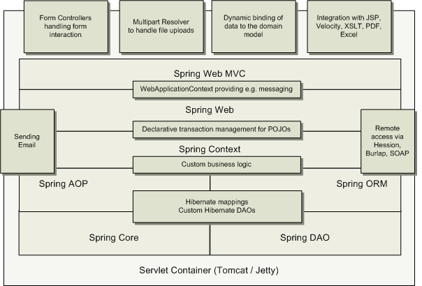 所有自定义的业务逻辑可以通过简单的POJO来实现,并利用Spring的IoC容器进行管理。对于其他的服务,比如发送email和不依赖web层的校验信息,还可以让你自己决定在哪里执行校验规则。