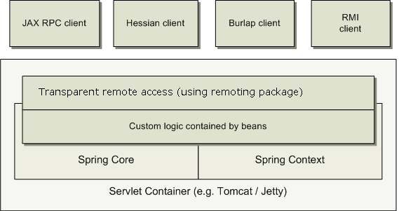 当你需要通过WebService来访问你的现有代码时,你可使用Spring提供的 Hessian-、Burlap-、Rmi- 为前缀的接口或者 JaxRpcProxyFactory 这个代理类。你会发现,远程访问现有应用程序不再那么困难了。