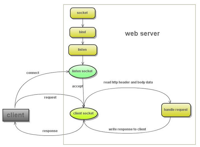 网上偷来的一张图(从哪里偷来的,我都告诉你了,多实在呀。哈哈。),显示在下面,简要说明web服务器的工作过程