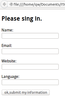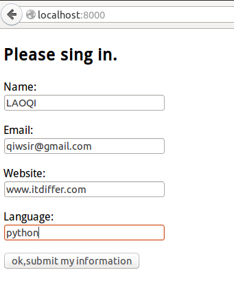 用户填写信息之后,点击按钮提交。注意观察上面的代码表单中,设定了post方法,所以,在python程序中,应该有一个post方法专门来接收所提交的数据,然后把提交的数据在另外一个网页显示出来。