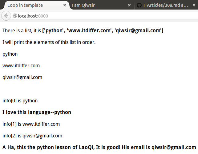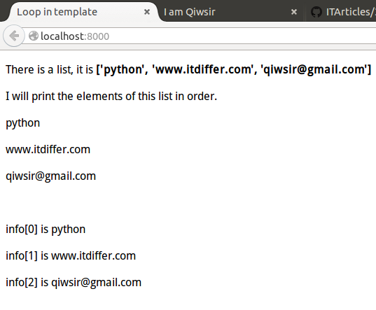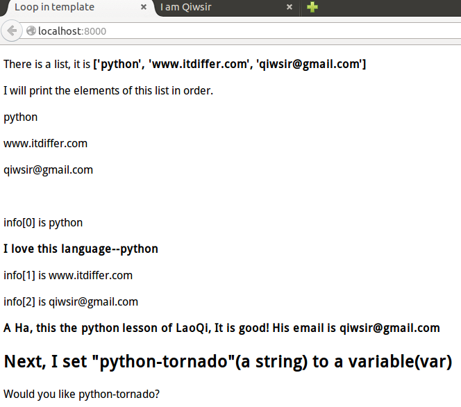 先写一个python文件(命名为index.py),这个文件中有一个列表["python", "www.itdiffer.com", "qiwsir@gmail.com"],要求是将这个列表通过self.render()传给模板。