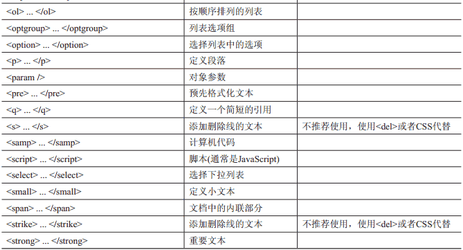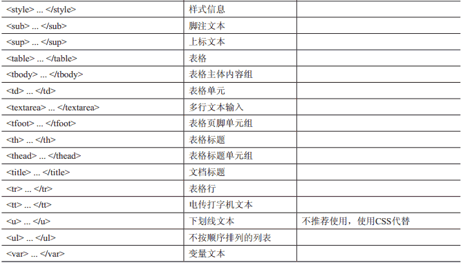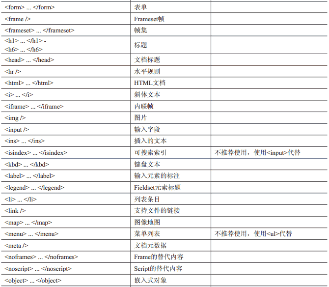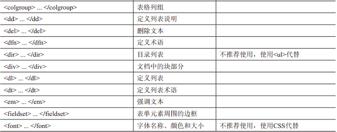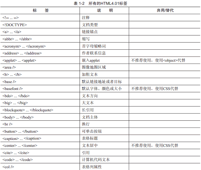 考虑到新手可能需要温故而知新, 或者需要一些建议, 表1-2列举了所有的HTML4.01