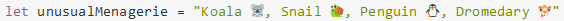 注意不是所有的21位 Unicode 标量都代表一个字符,因为有一些标量是留作未来分配的。已经代表一个典型字符的标量都有自己的名字,例如上面例子中的LATIN SMALL LETTER A和FRONT-FACING BABY CHICK。