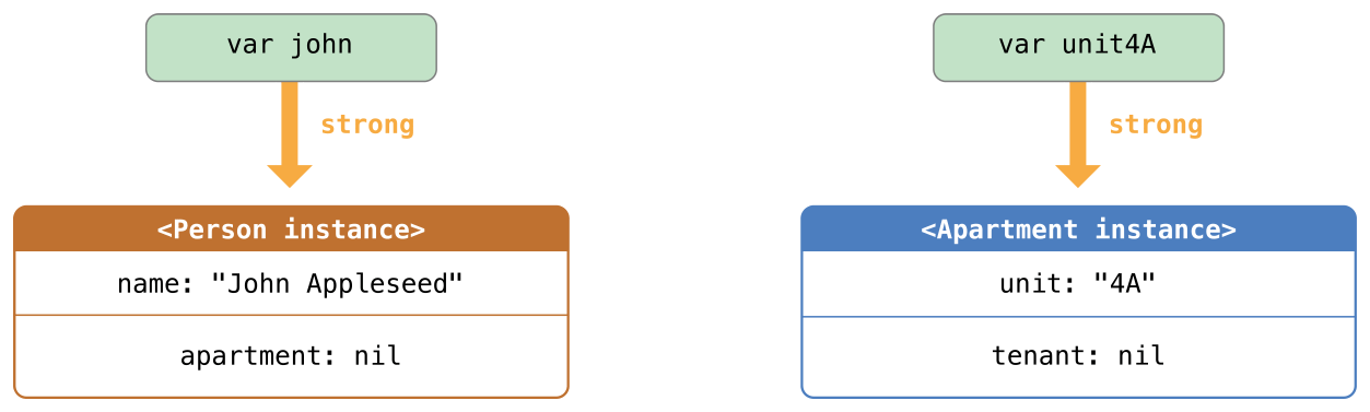 在两个实例被创建和赋值后,下图表现了强引用的关系。变量john现在有一个指向Person实例的强引用,而变量unit4A有一个指向Apartment实例的强引用:
