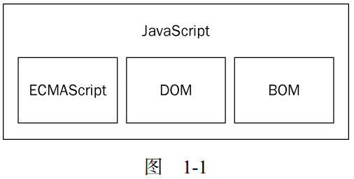 虽然 JavaScript 和 ECMAScript 通常都被人们用来表达相同的含义,但 JavaScript 的含义却比 ECMA-262 中规定的要多得多。没错,一个完整的 JavaScript 实现应该由下列三个不同的部分组成(见图 1-1)。