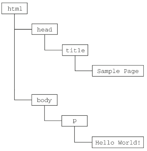 <html> <head> <title>Sample Page</title> </head> <body> <p>Hello World!</p> </body> </html>在 DOM 中,这个页面可以通过图 1-2 所示的分层节点图表示。