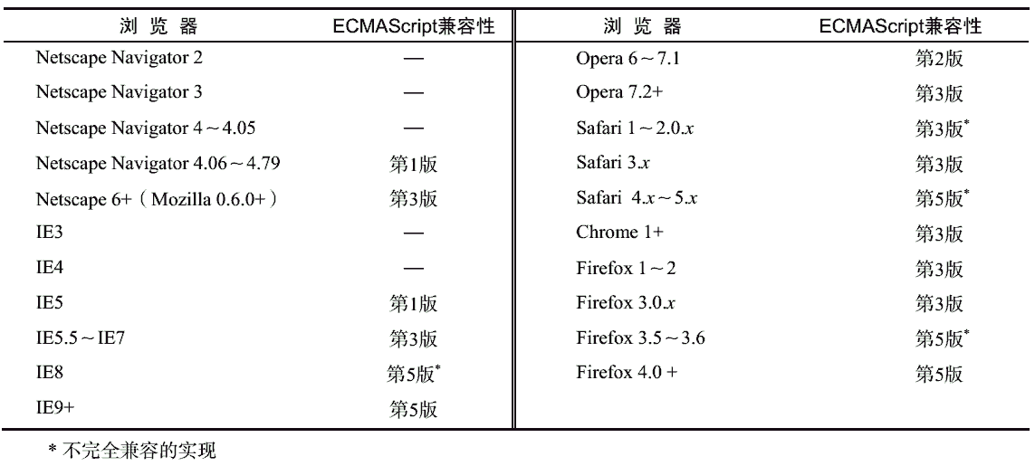 到了 2008 年,五大主流 Web 浏览器(IE、Firefox、Safari、Chrome 和 Opera)全部做到了与 ECMA-262兼容。 IE8 是第一个着手实现 ECMA-262 第 5 版的浏览器,并在 IE9 中提供了完整的支持。 Firefox 4 也紧随其后做到兼容。下表列出了 ECMAScript 受主流 Web 浏览器支持的情况。