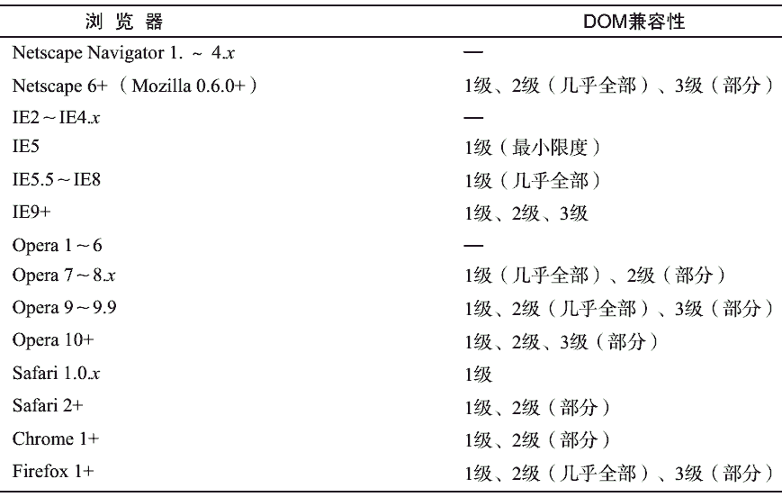 目前,支持 DOM 已经成为浏览器开发商的首要目标,主流浏览器每次发布新版本都会改进对 DOM的支持。下表列出了主流浏览器对 DOM 标准的支持情况。