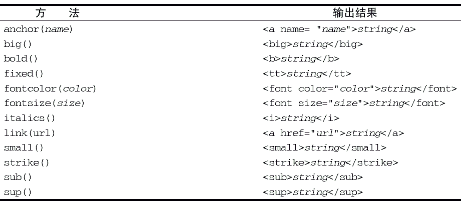 早期的Web 浏览器提供商觉察到了使用JavaScript 动态格式化HTML 的需求。于是,这些提供商就扩展了标准,实现了一些专门用于简化常见HTML 格式化任务的方法。下表列出了这些HTML 方法。不过,需要请读者注意的是,应该尽量不使用这些方法,因为它们创建的标记通常无法表达语义。方 法 输出结果