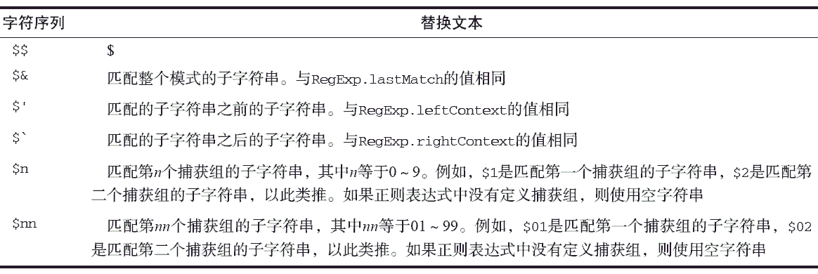 如果第二个参数是字符串,那么还可以使用一些特殊的字符序列,将正则表达式操作得到的值插入到结果字符串中。下表列出了ECMAScript 提供的这些特殊的字符序列。
