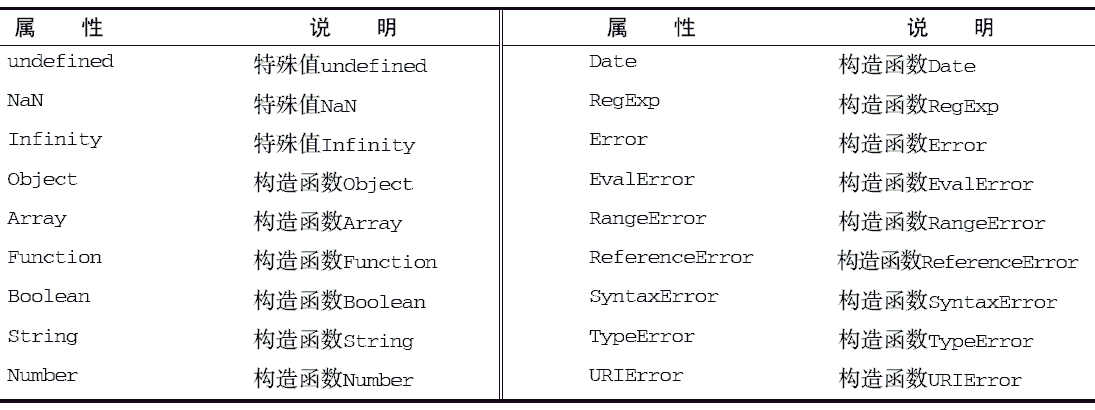 Global 对象还包含一些属性,其中一部分属性已经在本书前面介绍过了。例如,特殊的值undefined、NaN 以及Infinity 都是Global 对象的属性。此外,所有原生引用类型的构造函数,像Object 和Function,也都是Global 对象的属性。下表列出了Global 对象的所有属性。