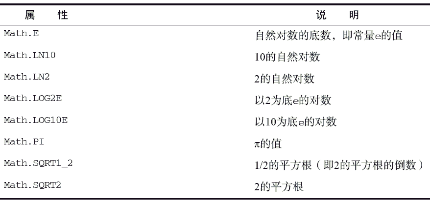 Math 对象包含的属性大都是数学计算中可能会用到的一些特殊值。下表列出了这些属性。