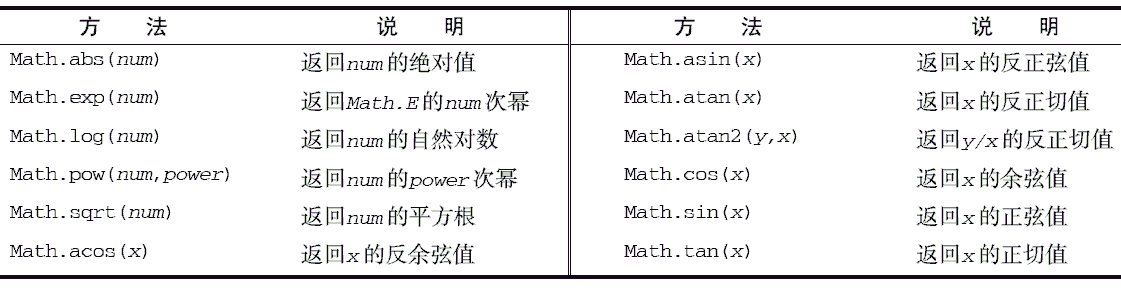 Math 对象中还包含其他一些与完成各种简单或复杂计算有关的方法,但详细讨论其中每一个方法的细节及适用情形超出了本书的范围。下面我们就给出一个表格,其中列出了这些没有介绍到的Math对象的方法。