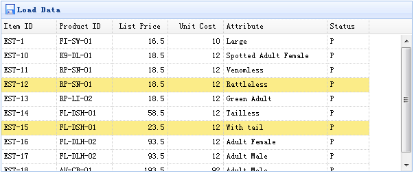 <table id="tt" class="easyui-datagrid" style="width:600px;height:250px" url="data/datagrid_data.json" title="Load Data" iconCls="icon-save"> <thead> <tr> <th field="itemid" width="80">Item ID</th> <th field="productid" width="80">Product ID</th> <th field="listprice" width="80" align="right">List Price</th> <th field="unitcost" width="80" align="right">Unit Cost</th> <th field="attr1" width="150">Attribute</th> <th field="status" width="60" align="center">Stauts</th> </tr> </thead> </table>