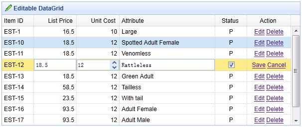 我们分配 numberspinner 编辑器到 'unit cost' 字段。 当开始编辑一行,用户可以通过 numberspinner 编辑器来编辑数据。