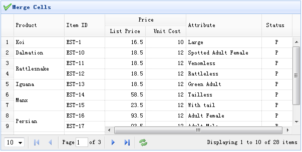 <table id="tt" title="Merge Cells" style="width:550px;height:250px" url="data/datagrid_data.json" singleSelect="true" iconCls="icon-save" rownumbers="true" idField="itemid" pagination="true"> <thead frozen="true"> <tr> <th field="productid" width="80" formatter="formatProduct">Product ID</th> <th field="itemid" width="100">Item ID</th> </tr> </thead> <thead> <tr> <th colspan="2">Price</th> <th rowspan="2" field="attr1" width="150">Attribute</th> <th rowspan="2" field="status" width="60" align="center">Stauts</th> </tr> <tr> <th field="listprice" width="80" align="right">List Price</th> <th field="unitcost" width="80" align="right">Unit Cost</th> </tr> </thead> </table>