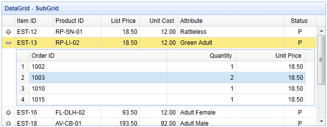 <table id="dg" style="width:700px;height:250px" url="datagrid22_getdata.php" title="DataGrid - SubGrid" singleSelect="true" fitColumns="true"> <thead> <tr> <th field="itemid" width="80">Item ID</th> <th field="productid" width="100">Product ID</th> <th field="listprice" align="right" width="80">List Price</th> <th field="unitcost" align="right" width="80">Unit Cost</th> <th field="attr1" width="220">Attribute</th> <th field="status" width="60" align="center">Status</th> </tr> </thead> </table>