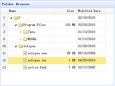 <table id="test" title="Folder Browser" class="easyui-treegrid" style="width:400px;height:300px" url="data/treegrid_data.json" rownumbers="true" idField="id" treeField="name"> <thead> <tr> <th field="name" width="160">Name</th> <th field="size" width="60" align="right">Size</th> <th field="date" width="100">Modified Date</th> </tr> </thead> </table>