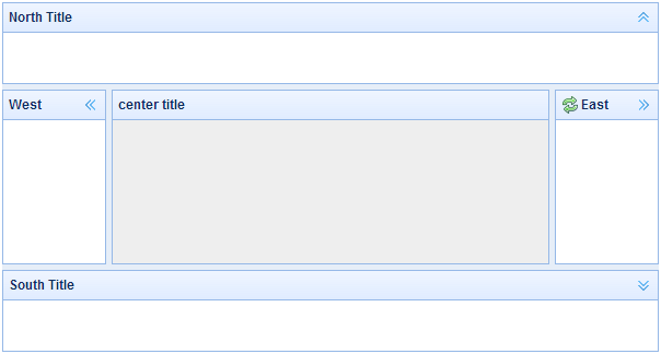 <body class="easyui-layout"> <div data-options="region:'north',title:'North Title',split:true" style="height:100px;"></div> <div data-options="region:'south',title:'South Title',split:true" style="height:100px;"></div> <div data-options="region:'east',title:'East',split:true" style="width:100px;"></div> <div data-options="region:'west',title:'West',split:true" style="width:100px;"></div> <div data-options="region:'center',title:'center title'" style="padding:5px;background:#eee;"></div> </body>
