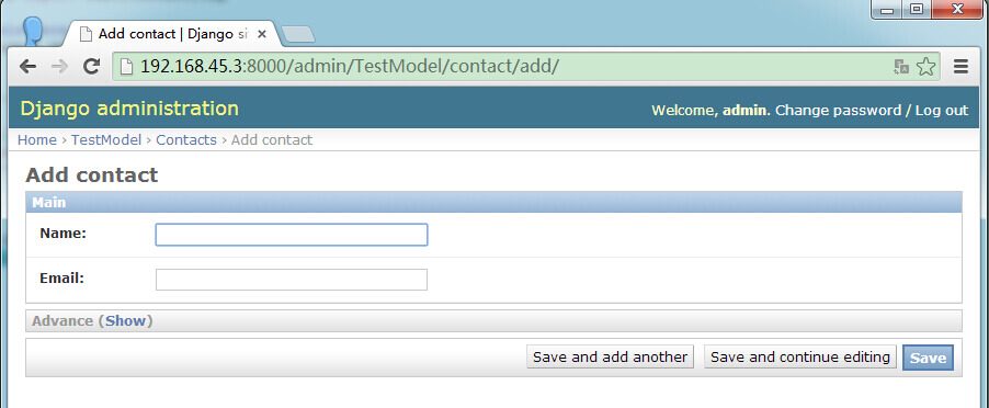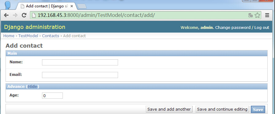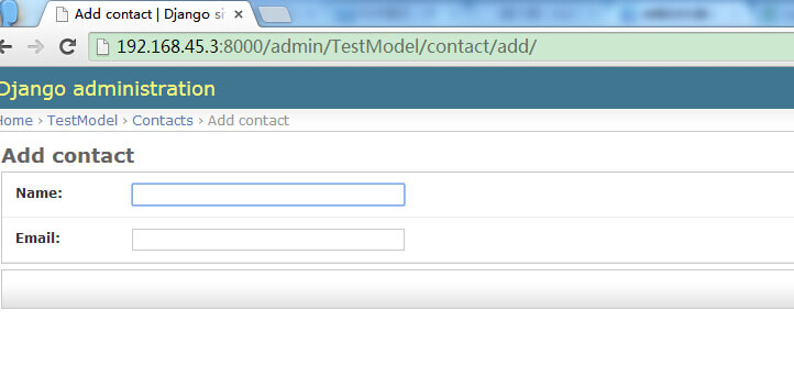 我们可以自定义管理页面,来取代默认的页面。比如上面的"add"页面。我们想只显示name和email部分。修改 TestModel/admin.py: