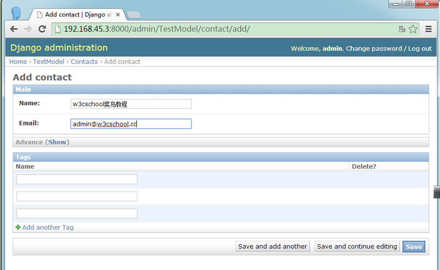 而在默认的页面显示中,将两者分离开来,无法体现出两者的从属关系。我们可以使用内联显示,让Tag附加在Contact的编辑页面上显示。