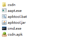 把下载好的apktool解压后,我们可以看到下述文件(忽略那两个csdn,一个是反编译的apk,一个是反编译后文件):