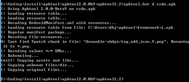 接下来,双击cmd.exe,来到命令行,键入: apktool.bat d csdn.apk 即可,Enter回车: