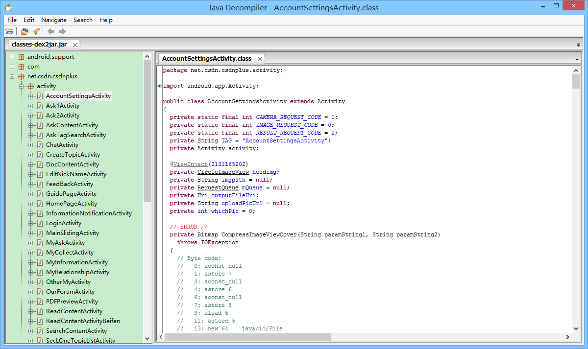 csdn的客户端竟然不混淆代码...可能是本着开源的精神吧,给我们学习代码吧!一般的话,apk发布都会 进行混淆,然后进行一些加密,或者使用第三方的加密平台,用的比较多的"爱加密",有兴趣的也自行百度查看更加详细的介绍!
