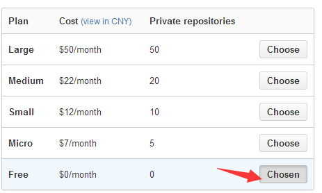 注册完,跳转到如下页面,选择仓库购买方式(私有仓库,别人不可以访问,要权限),一般我们自己玩选Free: PS:对了,这时候你邮箱可能收到一封验证邮件,点下完成验证。