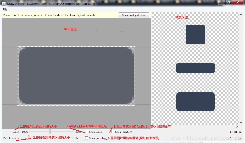 ②NinePatchEditor,相比起自带的,做了一些优化,支持批量操作,而且界面看起来美观一点: 有兴趣的可以下载下,笔者平时用的这个,下载链接:NinePatchEditor.zip