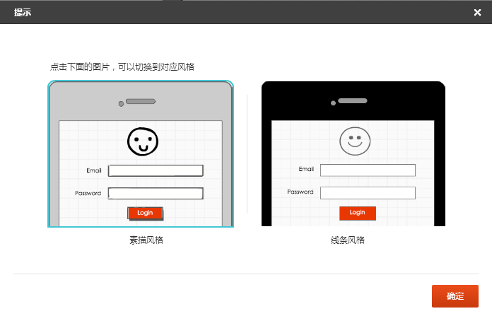 Step 1:注册一个你自己的账号,然后新建文件进入编辑界面!(时间关系,这里笔者直接试用) 然后弹出一个原型风格的对话框给我们选择:素描跟线条!